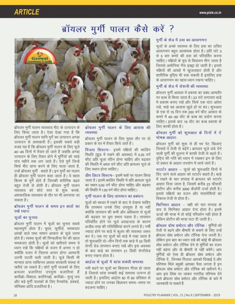 ब्रायलर मुर्गीपालन कैसे करें ? लेख ,पोल्ट्री प्लानर पत्रिका के सितम्बर-१९ अंक में प्रकाशित