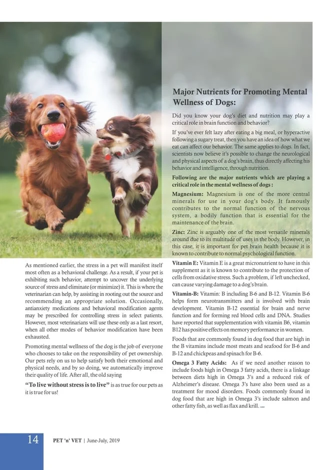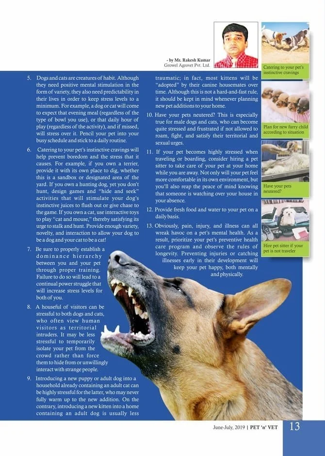 Reducing Stress & Promoting Mental Wellness of Dogs- Published in Pet ‘n’ Vet Magazine : June-July-19.The  article  is  written  by – Mr.  Rakesh  Kumar